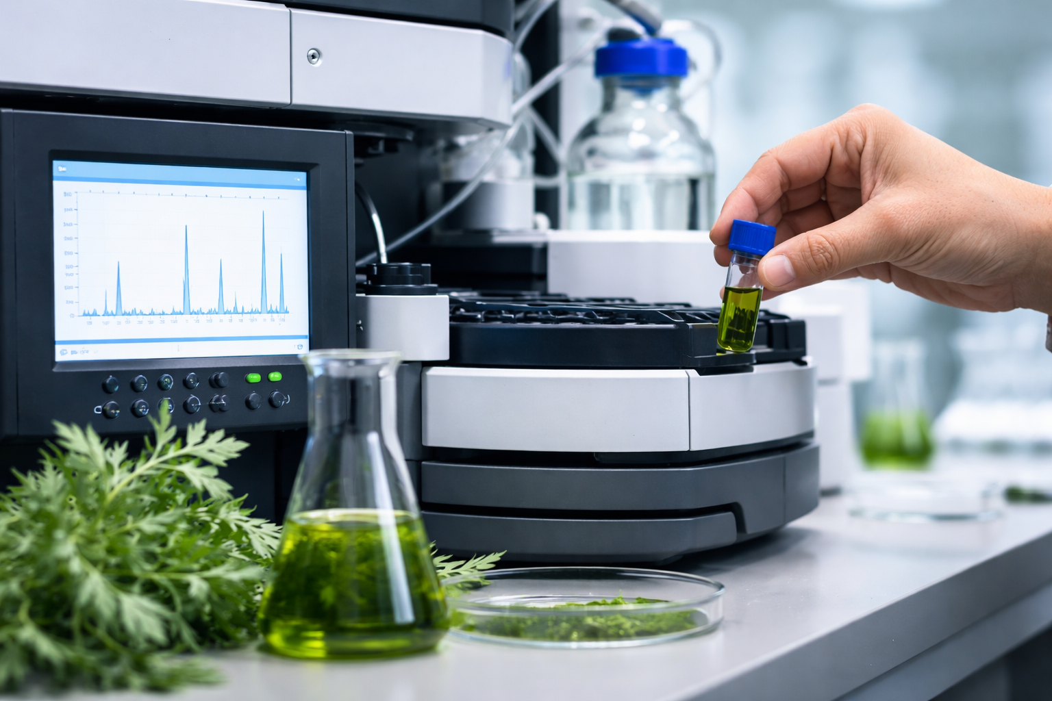 Our in-house extraction capabilities include maceration and solvent-based extraction, NADES systems, and supercritical CO₂ extraction. Analytical work is performed using HPLC, LC-MS, and spectrophotometry to profile phytochemicals and evaluate how cultivation and extraction influence potency and functional activity.